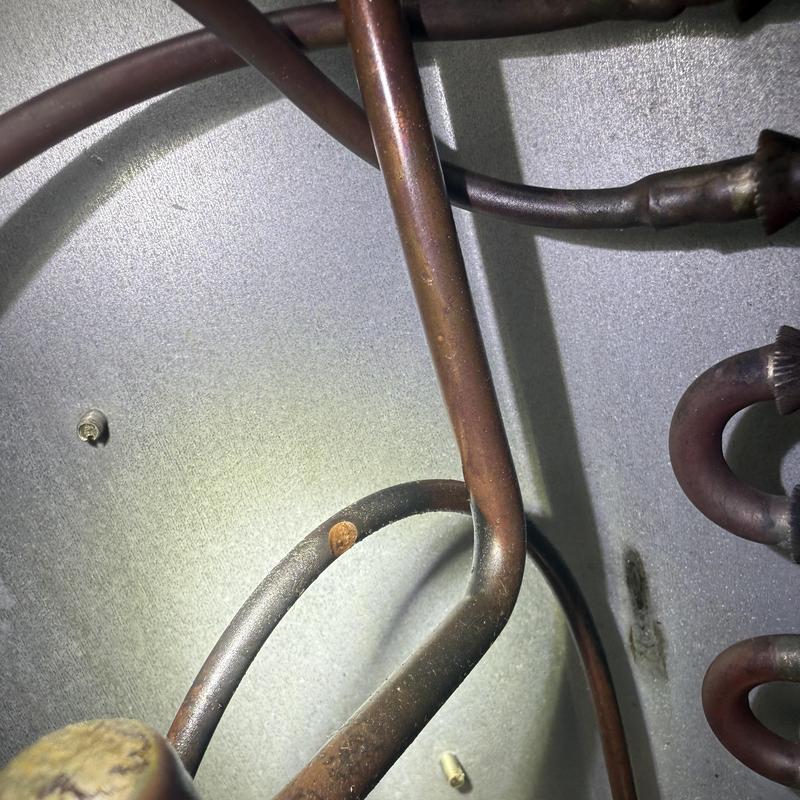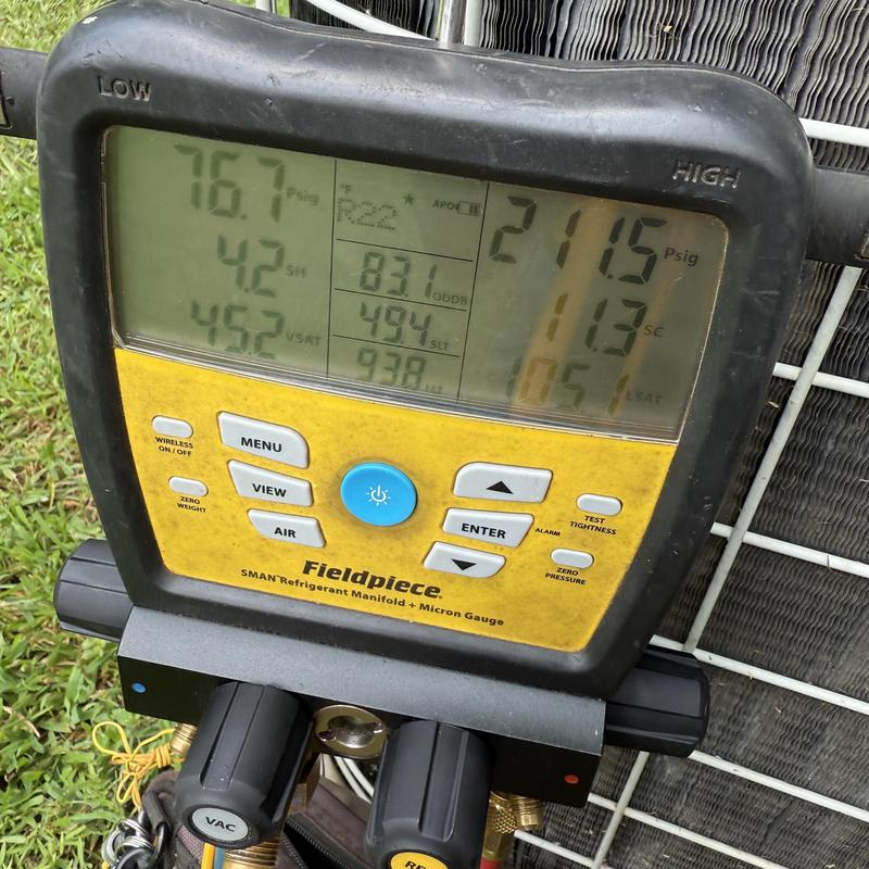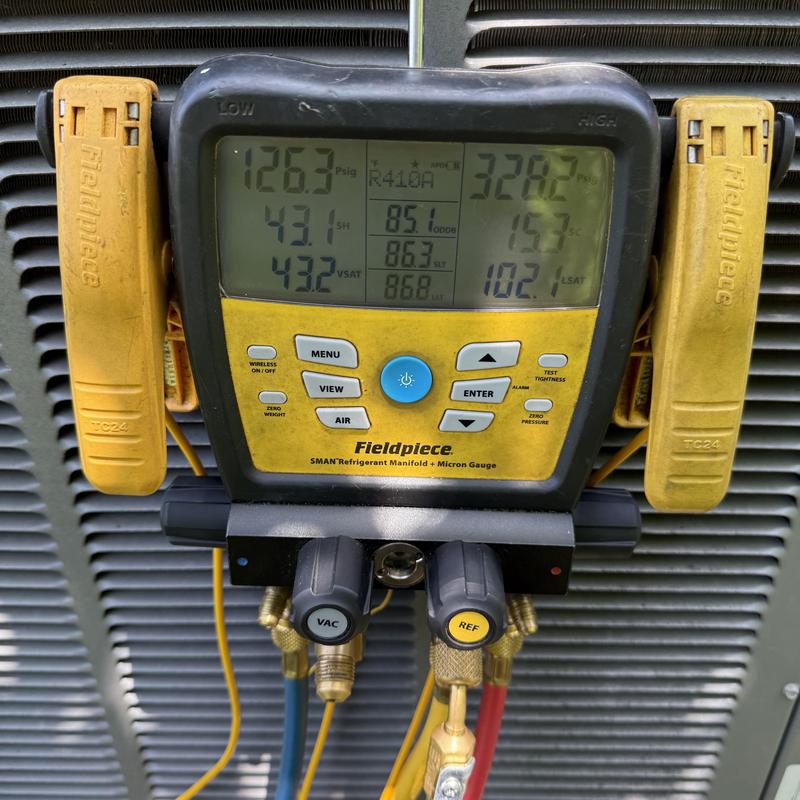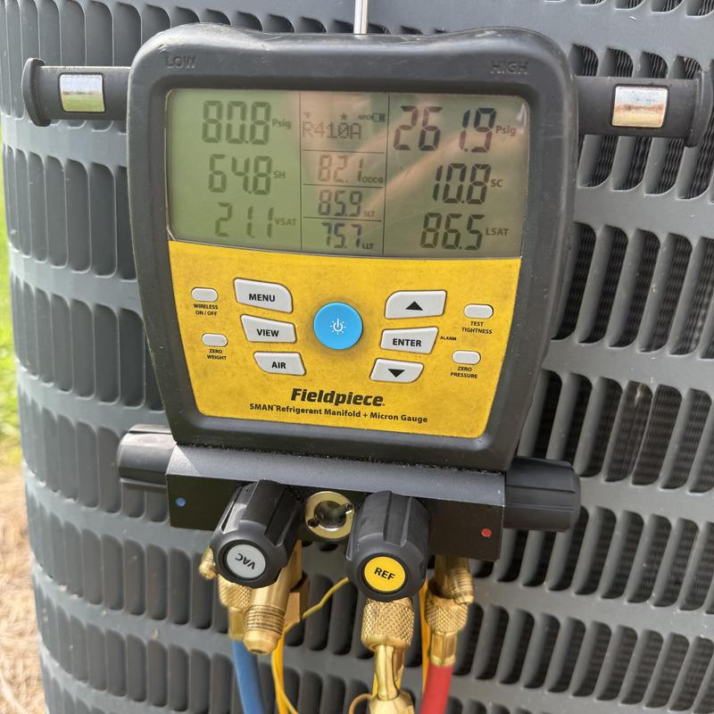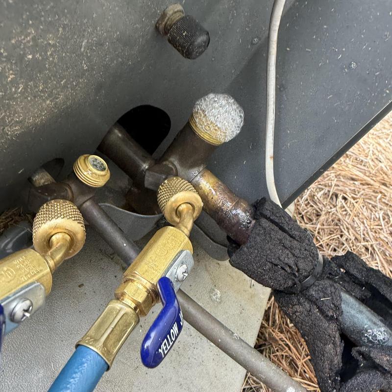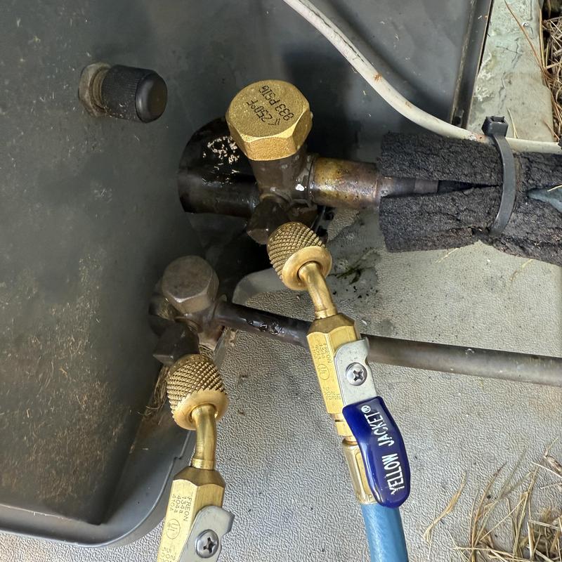 An HVAC technician in Lincolnton, North Carolina located and repaired a refrigerant leak in the copper tubing of an outdoor unit. They pressure tested the system, performed a vacuum, and recharged it with refrigerant. The air conditioning system is now cooling properly.