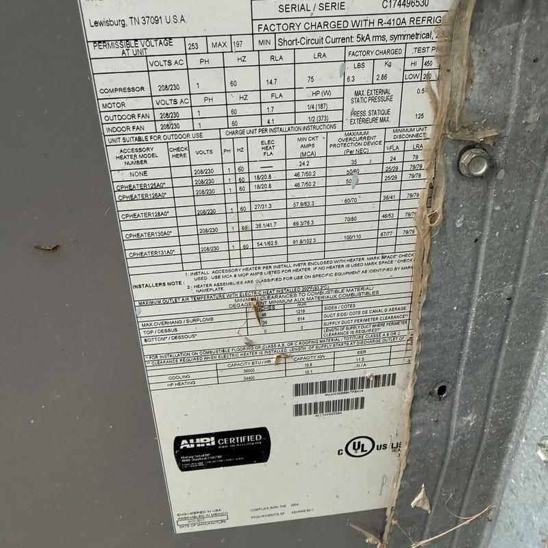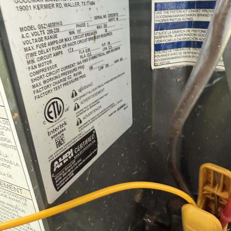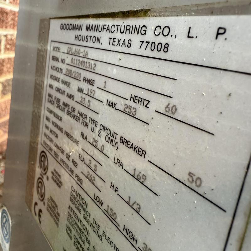Taylored Air inspected a 24-year-old Goodman heat pump in Lincolnton, North Carolina. The unit repeatedly tripped the breaker due to a compressor shorted to ground. The technician diagnosed the issue and provided quotes for both a full system replacement and compressor replacement.