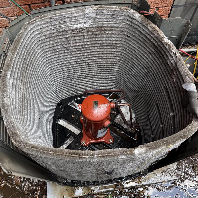 Taylored Air inspected a 5-ton rooftop HVAC unit in Lincolnton, North Carolina. Technicians thawed a frozen coil, identified low refrigerant levels, and located a refrigerant leak in the evaporator coil. The team is preparing quotes for either repair or replacement of the unit.