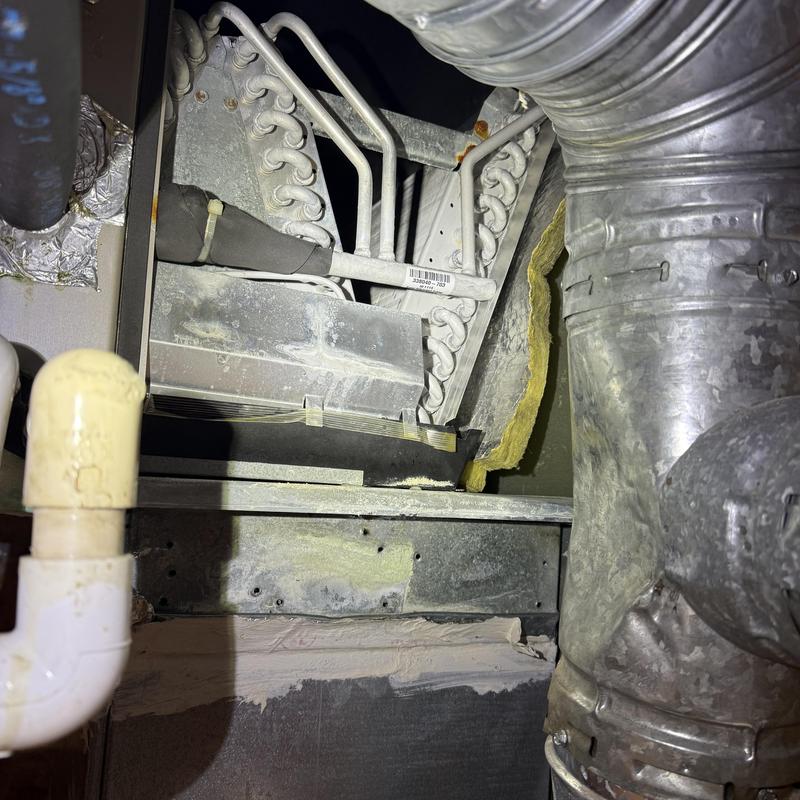 A technician repaired a cooling issue in Lincolnton, North Carolina. Loose cabinet insulation had blocked one side of the coil, causing the system to freeze. The technician repositioned and secured the insulation, allowing the system to cool correctly.