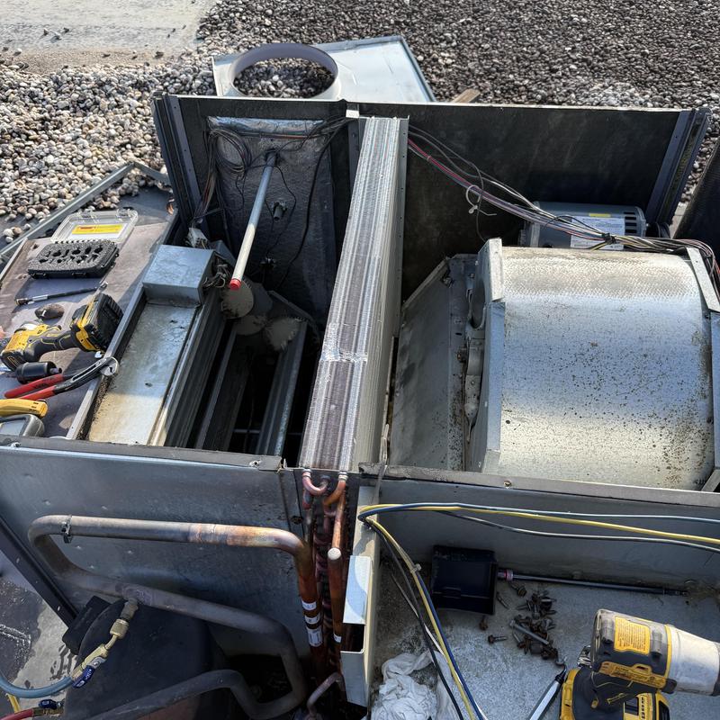 Taylored Air replaced a leaking evaporator coil in a 5-ton Carrier rooftop unit. Technicians pressure-tested the system, pulled a vacuum, and recharged it with refrigerant. The unit is now operating correctly. Service took place in Lincolnton, North Carolina.