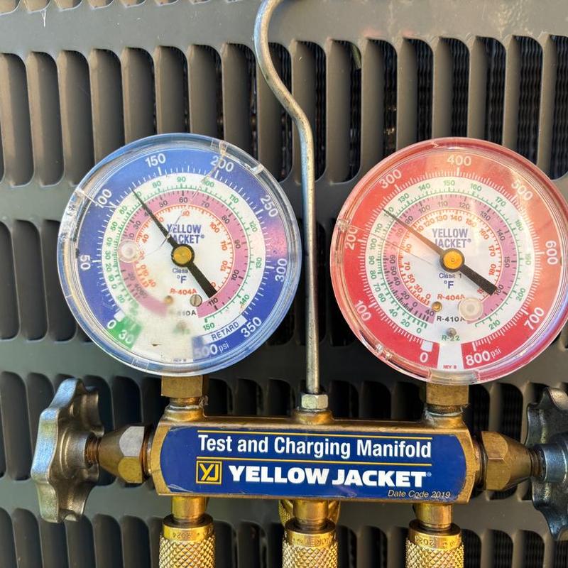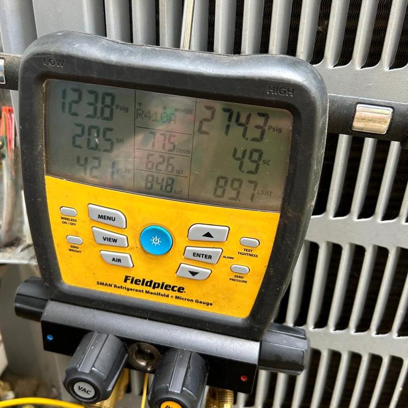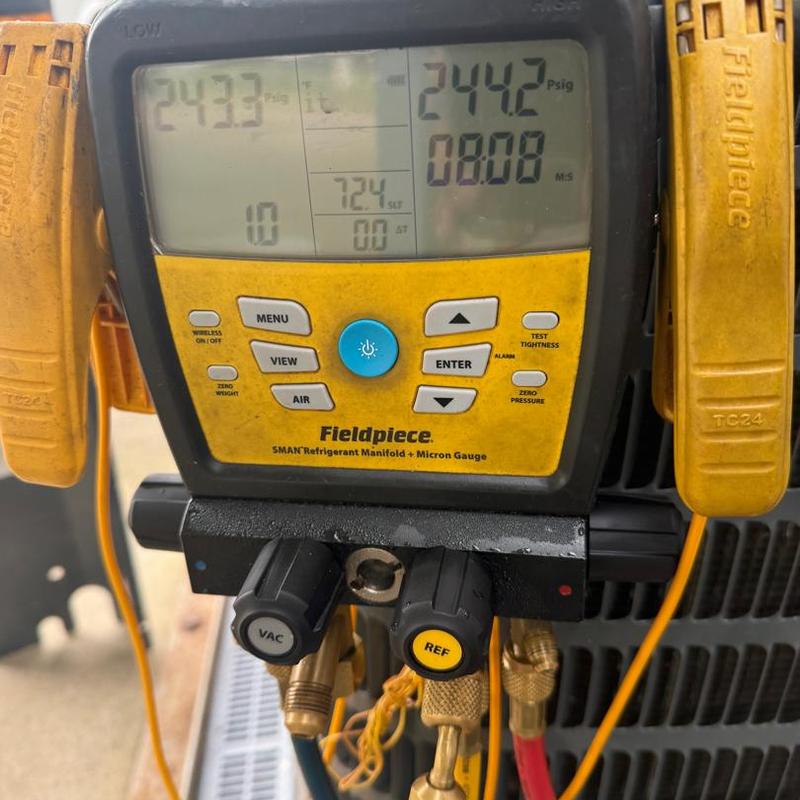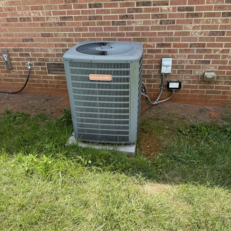 Taylored Air reconnected a Goodman outdoor unit in Shelby, North Carolina. The technician pressure tested the system, vacuumed it down to 300 microns, and recovered 65 oz of refrigerant. They added 48 oz of R-410A to meet the factory charge. The air conditioning system is now cooling correctly.