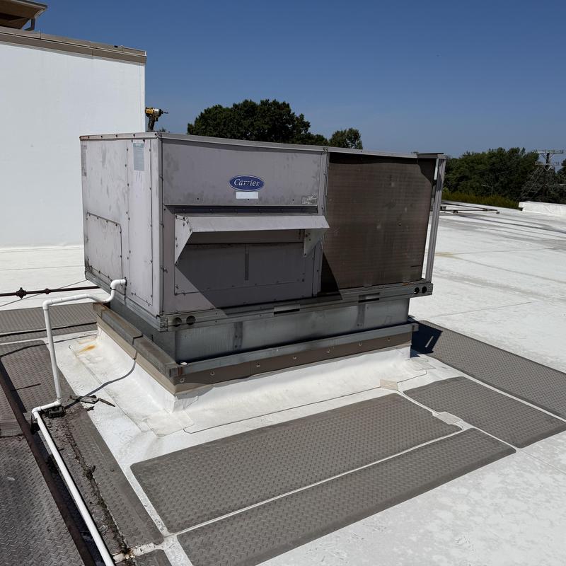 Taylored Air completed summer maintenance on a Carrier rooftop unit in Hickory, North Carolina. The team replaced air filters and washed the condenser coils to support efficient cooling performance.