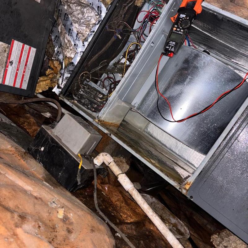 A technician in Cherryville, North Carolina, replaced a failed transformer and corrected furnace drainage by installing a PVC line to a P-trap. This repair resolved water intrusion issues and restored full system function.