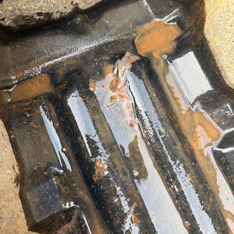 An HVAC technician in Albemarle, North Carolina cleared a clogged drain line in an air conditioning system. The technician removed water from the drain pan and extracted a small frog. The system now drains effectively.
