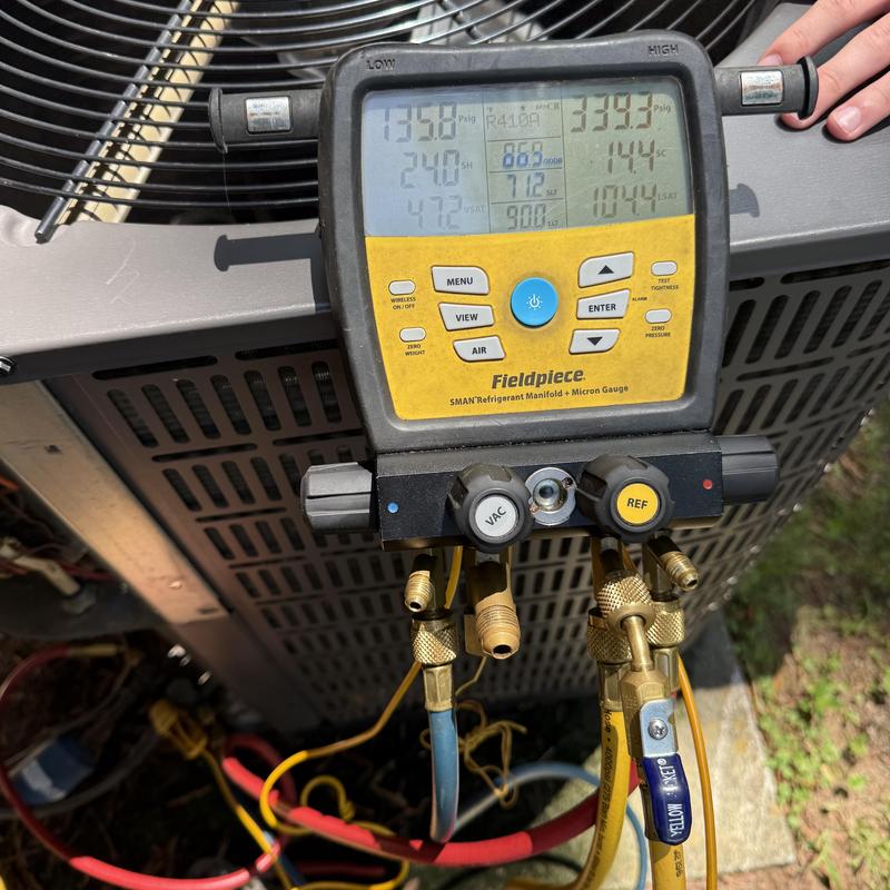 Taylored Air reconnected a Goodman outdoor unit in Shelby, North Carolina. The technician pressure tested the system, vacuumed it down to 300 microns, and recovered 65 oz of refrigerant. They added 48 oz of R-410A to meet the factory charge. The air conditioning system is now cooling correctly.
