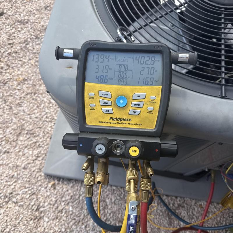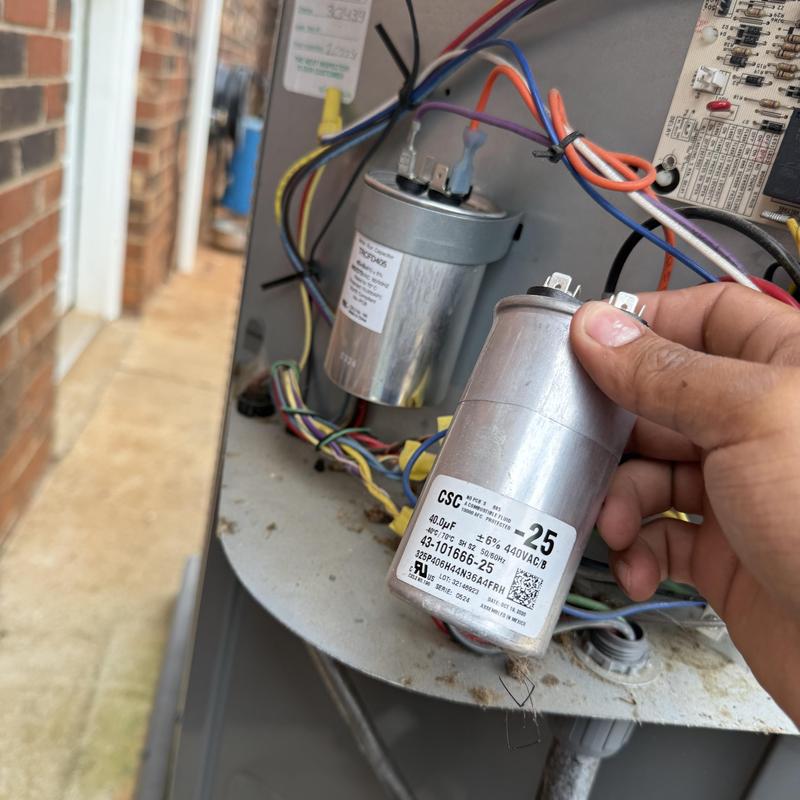 A technician in Hickory, North Carolina diagnosed a non-cooling AC system. The condenser fan was operating, but the compressor failed to start. The technician identified and replaced a faulty capacitor to restore cooling performance.
