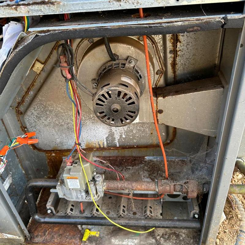 A technician in Conover, North Carolina inspected a furnace and found a rusted inducer motor housing with visible damage. The system displayed error codes. The technician recommended replacing the inducer motor assembly and the heat exchanger collector box due to corrosion.