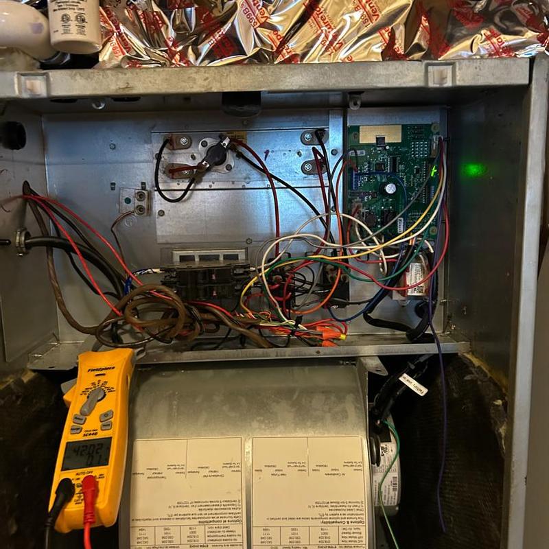 In Lincolnton, North Carolina, a TAYLORED AIR technician replaced a broken low-voltage fuse inside a Ruud gas furnace on November 12, 2025. Following the replacement, the system's voltage was tested to confirm restored power and reliable heating, ensuring efficient warmth for local residents during colder months.
