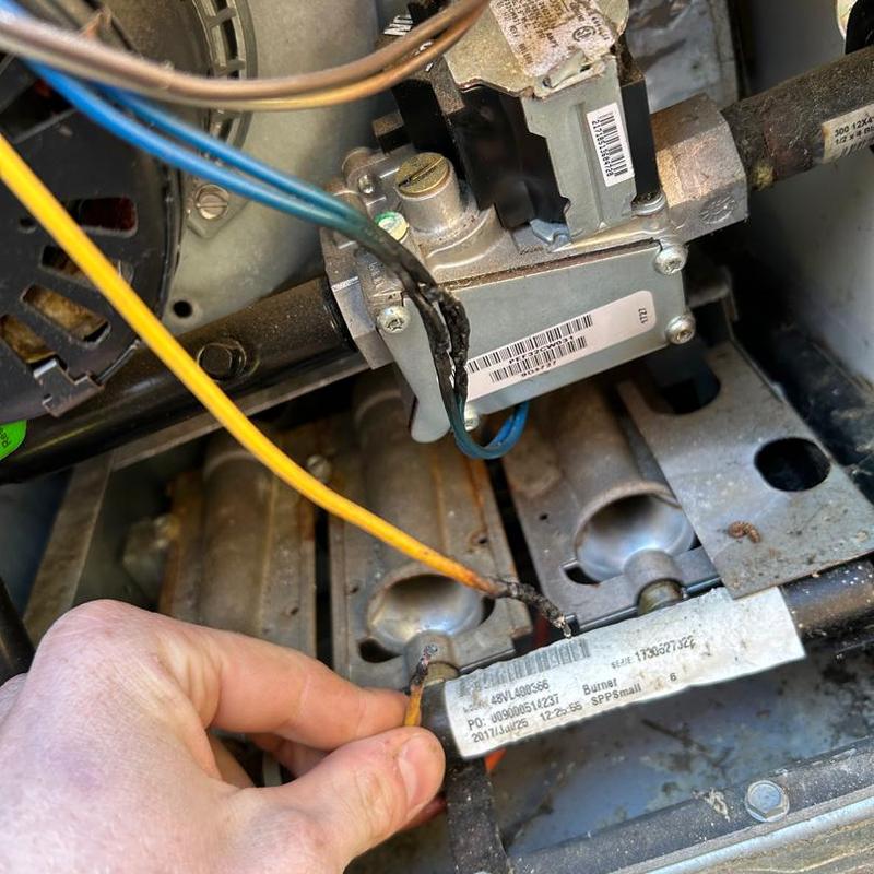 A technician in Gastonia, North Carolina repaired damaged furnace wiring caused by flame rollout and a broken limit switch. The repair included rewiring, relocating the flame sensor and spark igniter. The heating system now functions correctly and maintains normal operation.