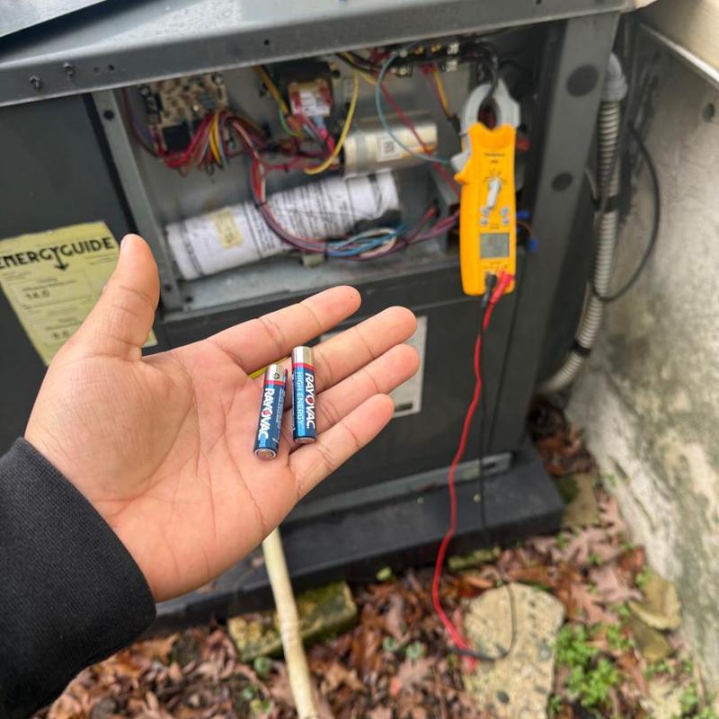 A technician reset a tripped breaker on an outdoor HVAC unit in Lincolnton, North Carolina. The heating system resumed normal operation after the repair.