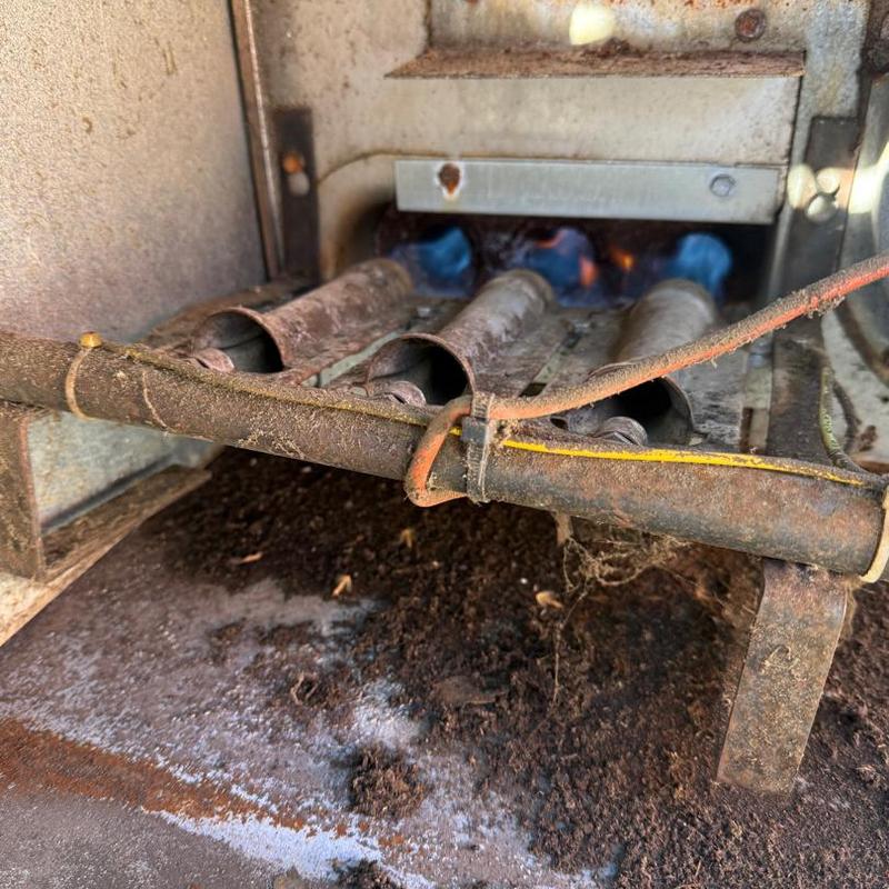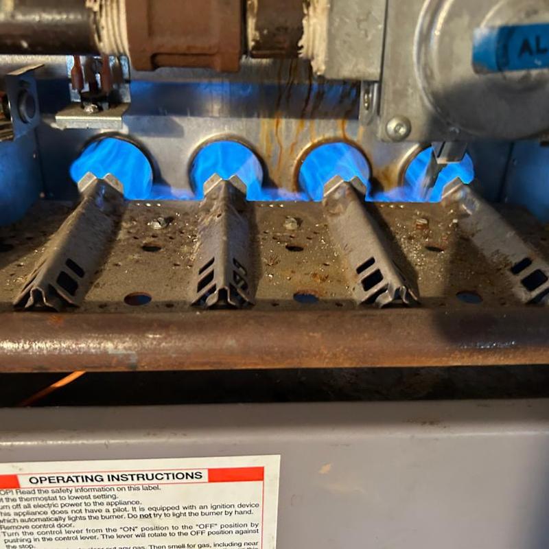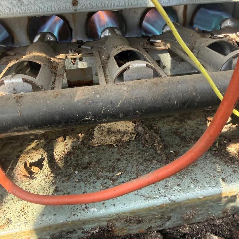 A technician in Lincolnton, North Carolina cleared debris from a furnace burner orifice that was blocking ignition. They used thermostat wire to dislodge buildup, reassembled the unit, and restored full burner operation. The flame sensor was also cleaned to improve furnace performance.