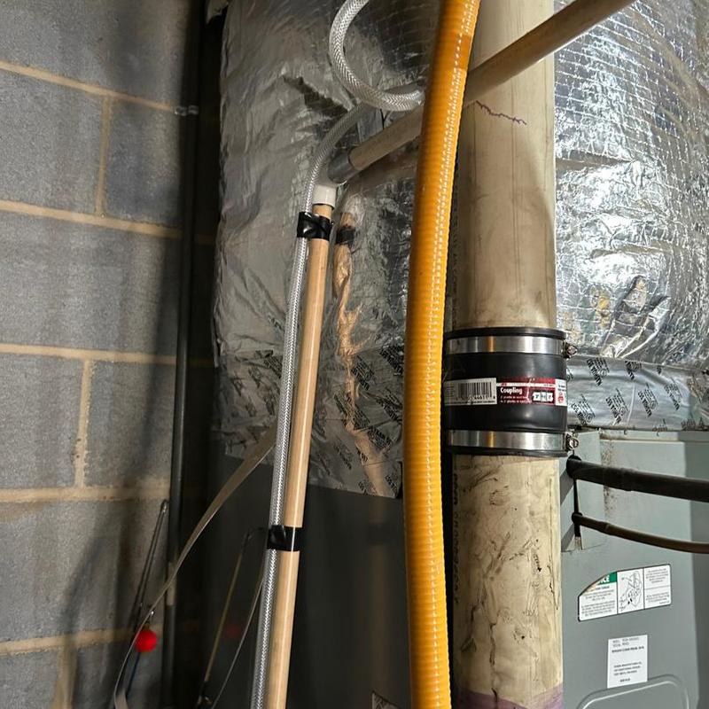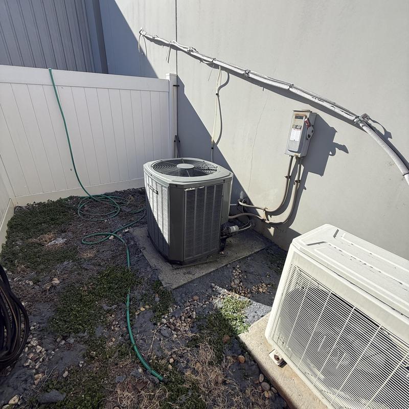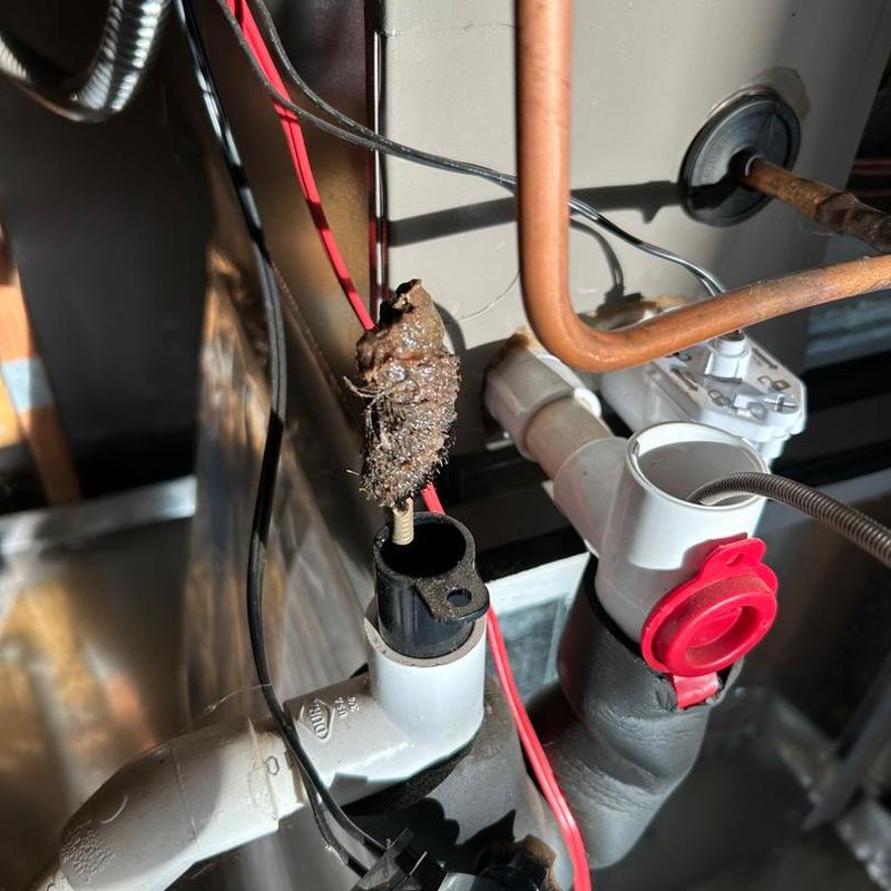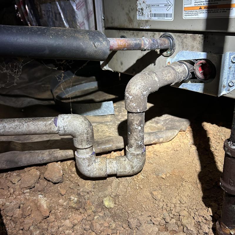 A technician in Lincolnton, North Carolina replaced a worn section of a condensate drain line. They removed six feet of damaged copper pipe and installed new vinyl tubing, securing the connection with a hose clamp. The drainage system now functions correctly.