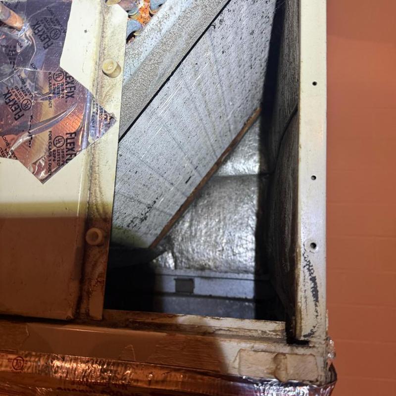 Taylored Air cleaned a dirty evaporator coil and reconnected a fallen crossover duct in Cherryville, NC, restoring efficient heating performance for homeowners this winter.