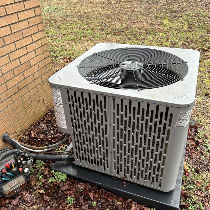 Technicians replaced a faulty compressor and reversing valve on a Rheem heat pump in Lincolnton, North Carolina. They pressure tested and vacuumed the system before recharging it with refrigerant. The unit now cools effectively.