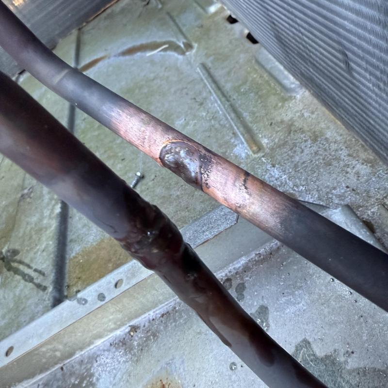 A technician in Lincolnton, NC, repaired a refrigerant leak in a package unit. The discharge line had rubbed against another copper tube, causing the leak. The system was repaired, pressure tested, vacuumed, and recharged with refrigerant to restore proper operation.