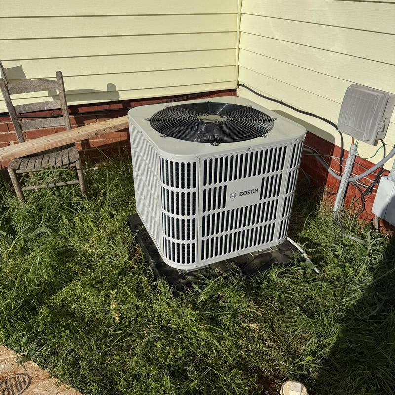 Taylored Air performed spring maintenance on a Bosch heat pump system in Lincolnton, North Carolina. The technician washed the condenser coils and confirmed the system was operating correctly.