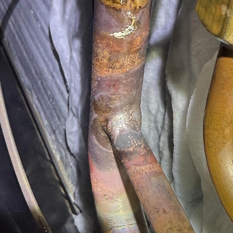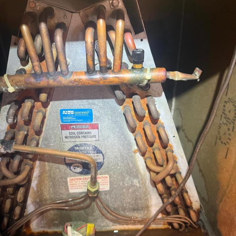 Taylored Air repaired a refrigerant leak in an air handler in Lincolnton, North Carolina. The technician located a faulty factory solder joint, sealed the area, pressure tested the system, vacuumed it, and added refrigerant to restore cooling performance.